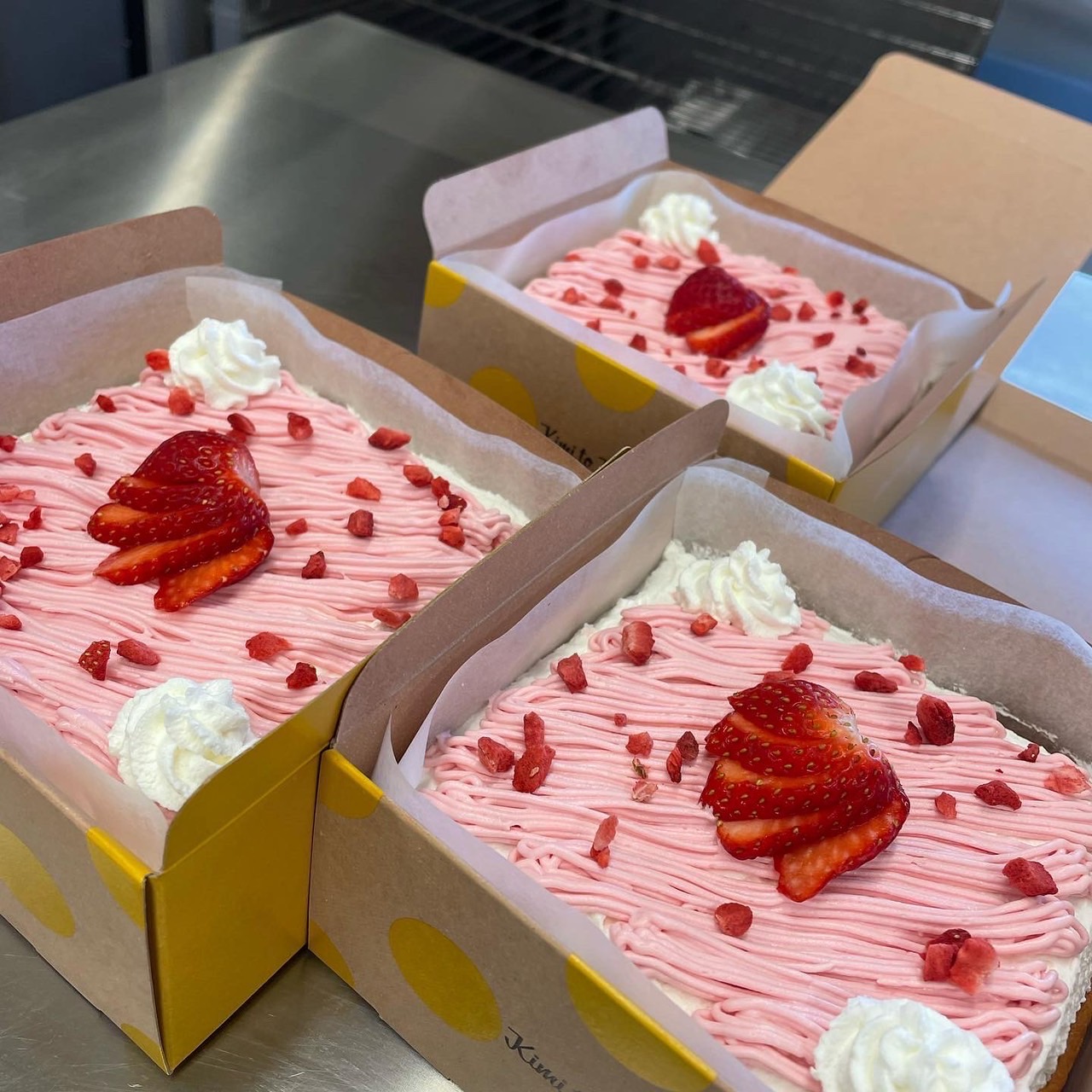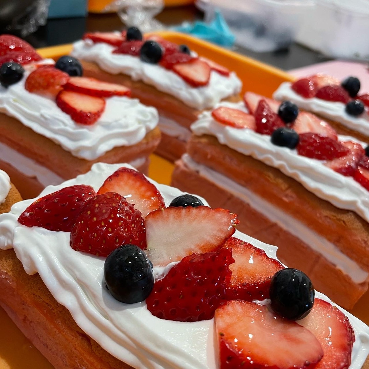 見た目がとっても可愛くてほんのりピンク色のいちごカステラに自家製ホイップを挟んで贅沢にいちご丸ごと1個をカットして乗せた商品です![]()