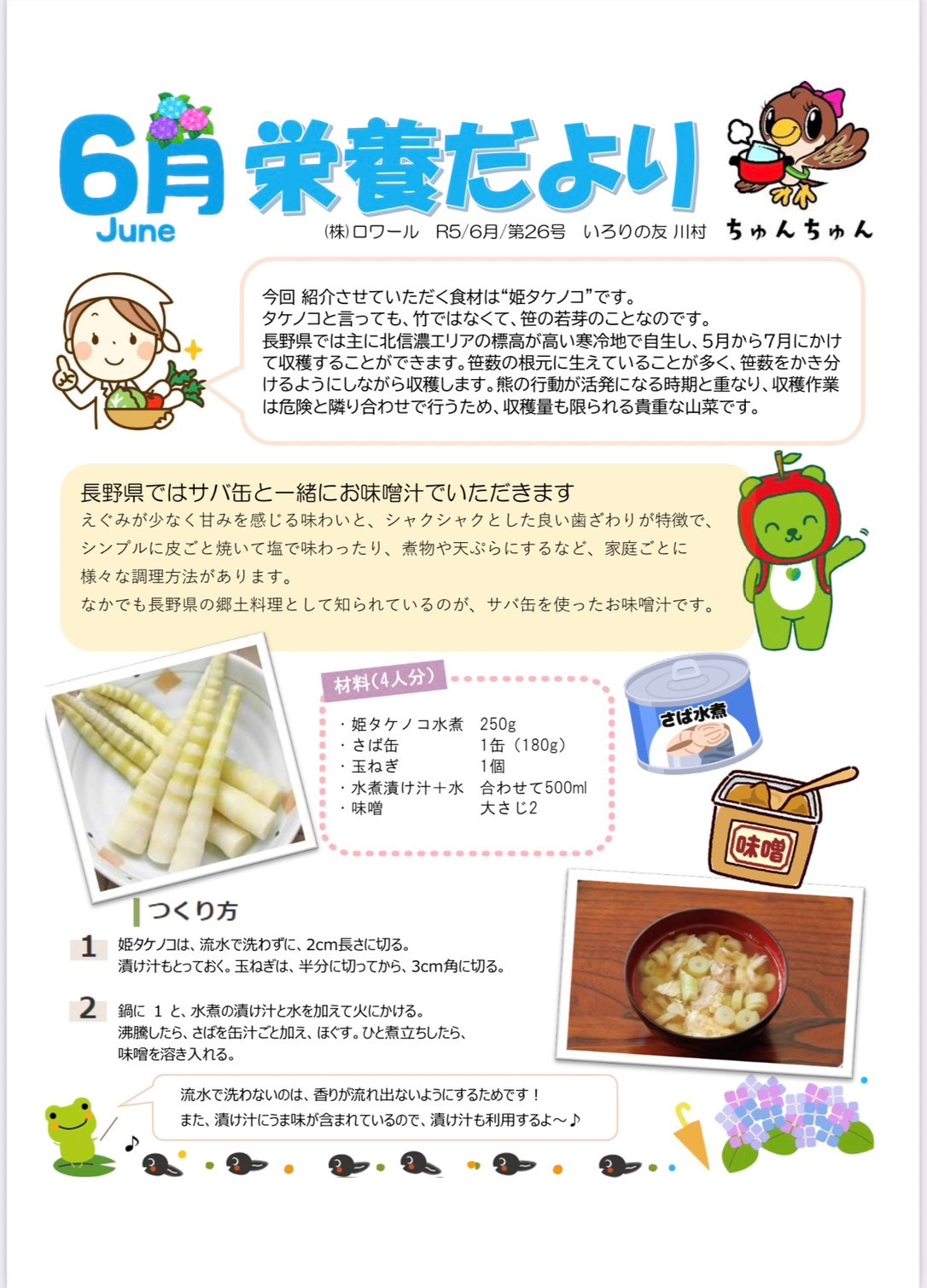 6月栄養だより 2023年05月06日 今回はあまりなじみはないですが、とても美味しい食材を紹介します その食材は【姫タケノコ】です タケノコと言いますと煮物の料理が多いですが、今回はお味噌汁に入れてみました ゴールデンウィークで疲れた体に染み渡る美味しい1品になってますので、ぜひ皆さん作ってみてください 栄養だより 5月 栄養だより 前へ 一覧へ 次へ おすすめ関連記事 2022年10月施設栄養だより 2022年09月27日 2022年12月施設栄養だより 2022年11月28日 2023年1月施設栄養だより 2022年12月06日 5月 栄養だより 2023年04月10日