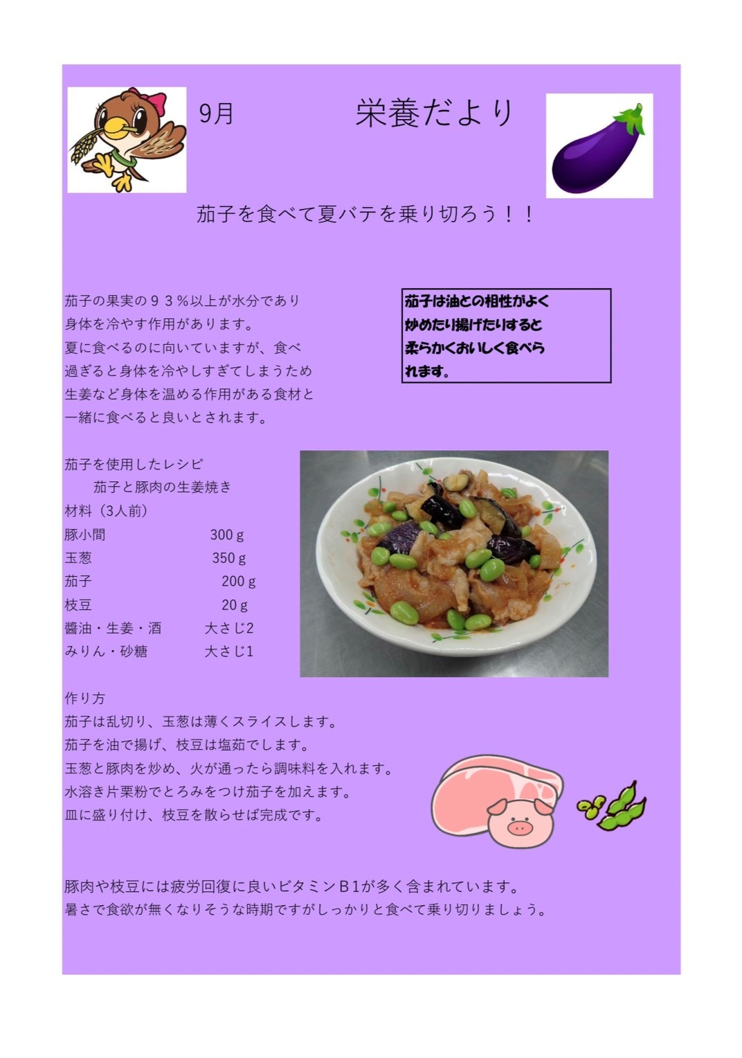 9月栄養だより 2023年08月22日 9月の栄養だよりメニューは【茄子】です 【茄子】は揚げてよし、煮てよし、焼いてよしの万能野菜です🍆 今回は相性のよい豚肉にとガツンと生姜を効かせた茄子と豚肉の生姜炒めを紹介します まだまだ、暑い日が続きますが皆さん体調に気を付けて乗り切りましょう 栄養だより 8月栄養だより 前へ 一覧へ 次へ おすすめ関連記事 2022年10月施設栄養だより 2022年09月27日 2022年12月施設栄養だより 2022年11月28日 5月 栄養だより 2023年04月10日 8月栄養だより 2023年07月06日