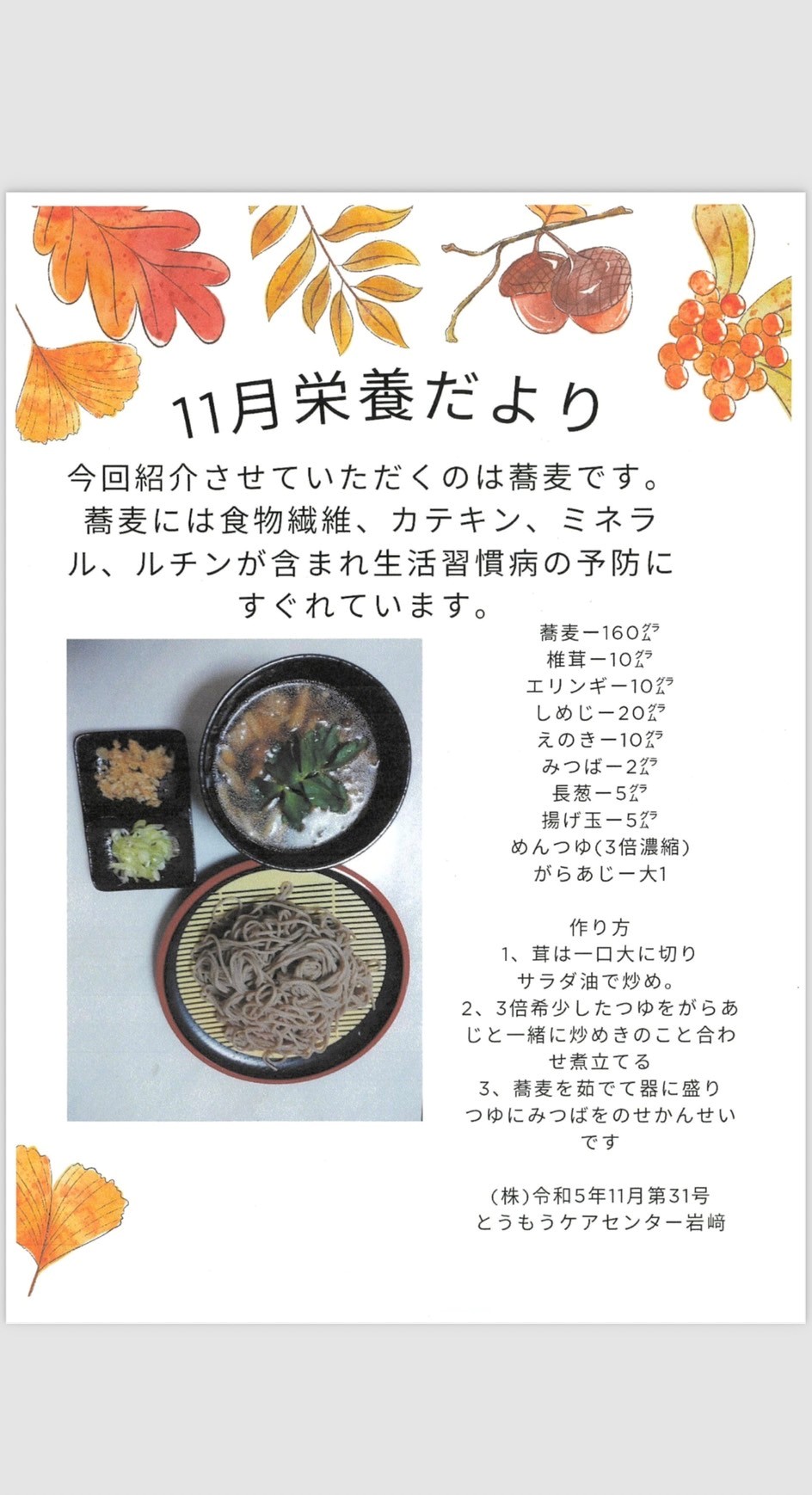 11月の栄養だよりは元そば職人の調理師さんが考えてくれた本格的きのこそばです!