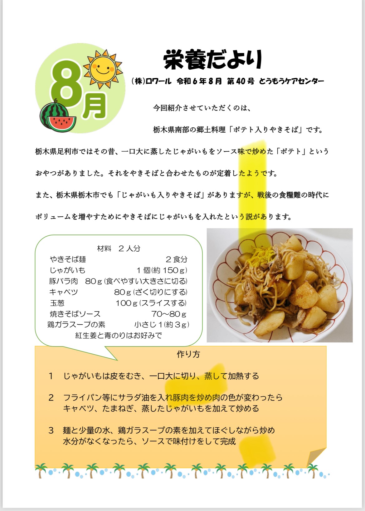 R6年8月 栄養だより 2024年07月15日 8月の栄養だよりは、栃木南部の郷土料理【ポテト入り焼きそば】です ソース味でボリューム満点の一品です お子様のおやつにもばっちりです 皆さんもぜひ作ってみてください 栄養だより R6年7月栄養だより 前へ 一覧へ 次へ おすすめ関連記事 2022年10月施設栄養だより 2022年09月27日 2022年12月施設栄養だより 2022年11月28日 R6年 5月栄養だより 2024年04月25日 R6年 9月栄養だより 2024年08月06日