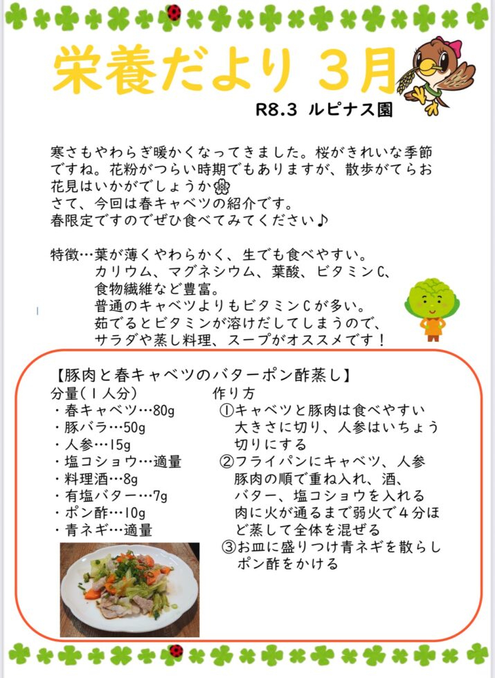 3月の栄養だよりは【豚肉と春キャベツのバターポン酢蒸し】です![]()